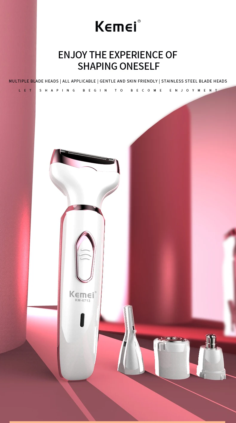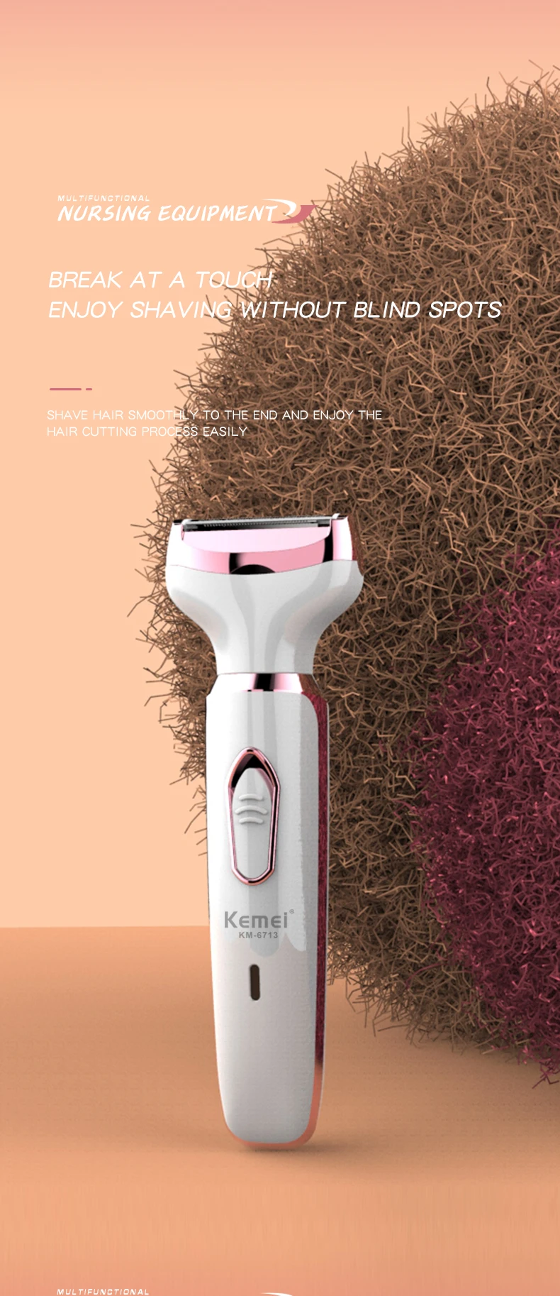 Le rasoir électrique portable Kemei KM-6713 est conçu pour une épilation complète et sans effort. Grâce à sa lame incurvée de précision, il épouse parfaitement la peau sans l'irriter, offrant un rasage doux et indolore.
