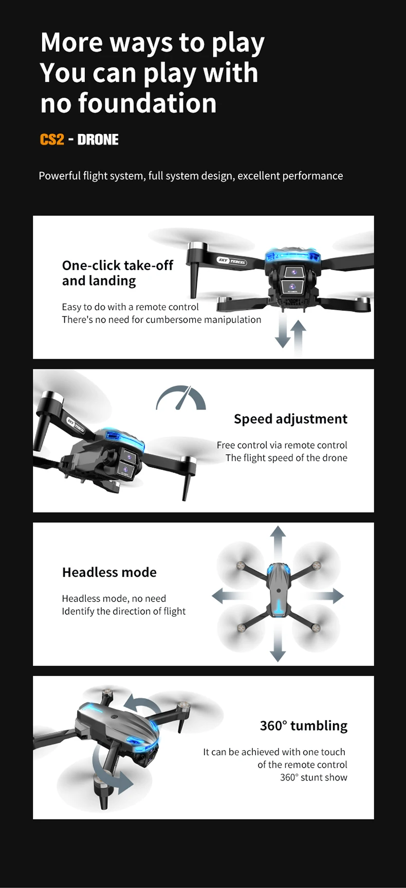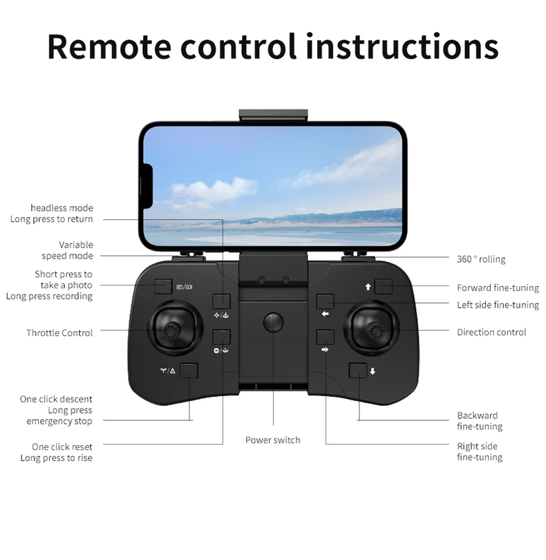 Fonctions : haut/bas/avant/arrière/gauche/droite, vol latéral, lumière LED, mode sans tête, retour automatique en un clic.