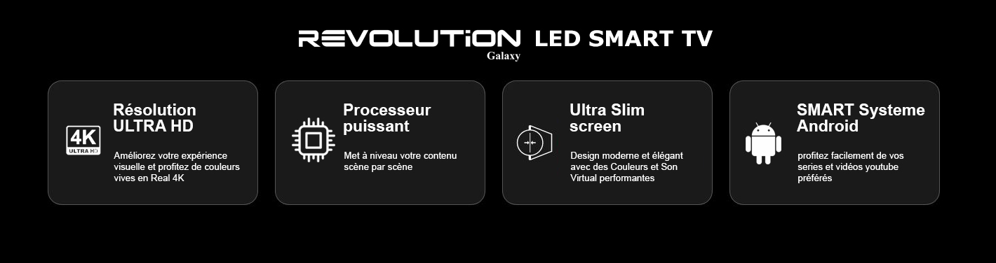 Découvrez la Télévision 65 Revolution, une prouesse technologique qui transforme votre salon en une salle de cinéma privée. Avec son écran FLAT LED de 65 pouces, plongez au cœur d'une expérience visuelle sans précédent, magnifiée par la résolution Ultra HD 4K (3840x2160). Cette smart TV n'est pas seulement un téléviseur; c'est une fenêtre ouverte sur un monde de contenus infinis, grâce à la version Android .